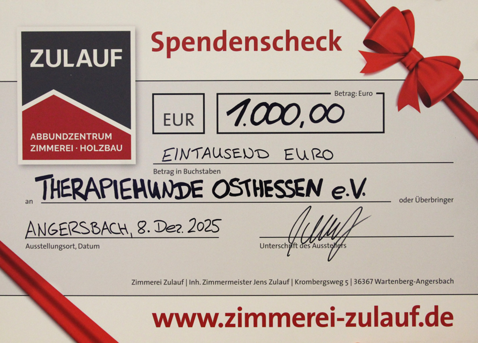 Dieses Jahr ging unsere Weihnachtsspende in Höhe von 1.000,00 EUR an die Therapiehunde Osthessen e.V. in Angersbach.